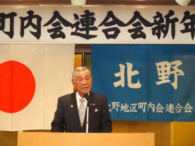 挨拶に立った岡本諒町連会長は「今、町内会活動は、役員の高齢化、役員のなり手不足、諸物価値上がりによる事業の縮小などで危機的な状況といえます」「しかし、2026年はうま年。エネルギーと行動力が高まり物事がウマくいく、飛躍するといったポジティブな意味がこめられます。北野町連は草原を颯爽と駆け抜ける馬のように果敢に挑戦し、万事ウマくいく1年にしたいと考えています」と述べました。